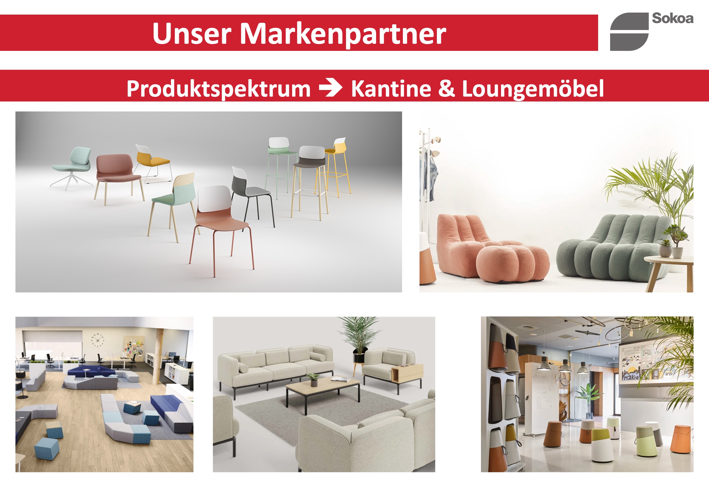 Ansprechende CoWorking Lösungen und Loungemöbel runden das Programm ab.